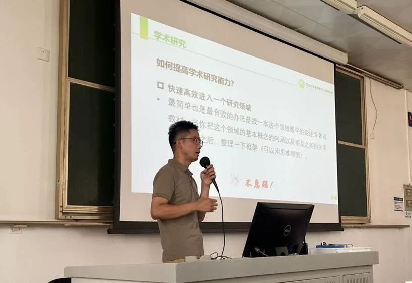 最后,青年教师专职辅导员张海成副教授开展了学业专题教育,从修德立志、学术之路、人际关系等角度,围绕“研究生如何快速进入自己的研究领域”、“如何提升自己的研究能力”、“如何面对科研中的挫折和挑战以及怎样处理自己与导师和同学之间的关系”等话题进行了分享。张老师鼓励同学们勤奋自律,保持积极心态和耐心韧性,坚持锻炼、规律作息,努力做出有代表性的创新研究成果。