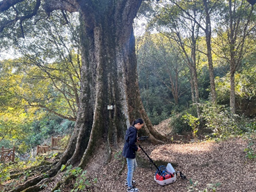 探地雷达“透视”根系:团队将探地雷达技术应用于林业,并通过人工智能算法对雷达信号进行分析,在克服了山坡陡坎等复杂地形限制后,成功探测并重建了地下1米内树木根系网,最粗的根系直径近60厘米,清晰揭示了古树的地下生命支撑系统。