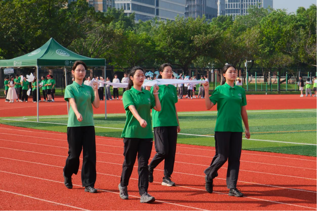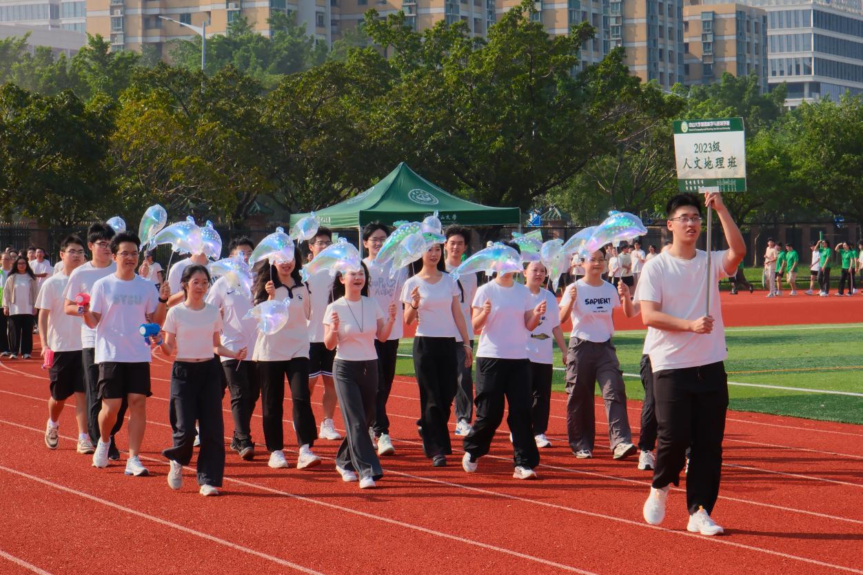 开幕式进行曲奏响了运动场的第一个高潮。地理科学与规划学院院旗在期待中庄严入场。旗手们步步坚定,节奏铿锵。他们身姿挺拔,眼神专注,年轻的面庞沐浴着晨光,写满了无畏的自信。肩上的院旗迎风舒卷,仿佛在向全场无声地传递着地理人坚韧、团结与昂扬的精神。
