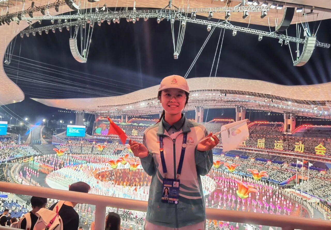 在本次第十五届全运会开幕式中,我服务于志愿者啦啦队。从开幕式前的广州赛区志愿者出征仪式,到之后的深圳赛区马术比赛;从开幕式场馆的志愿者之家、后勤服务,再到观众席上活力四射的啦啦操暖场表演,都有我们的身影。全运会是国家的大事,而我作为其中一颗小小的螺丝钉,却收获了看待世界的宽广视角。赛场运动员们咬牙坚持的样子,志愿者朋友们互帮互助的身影,都无疑会在我的青春岁月里留下一抹亮丽的色彩。