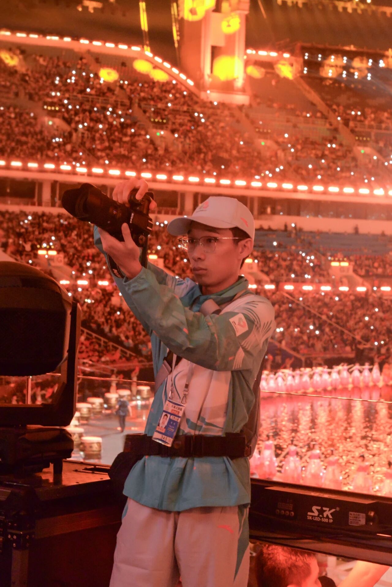 十分荣幸能参与十五运会开幕式志愿服务!作为宣传志愿者,我的镜头里装满了最暖的画面:合力传递及摆放观众喜乐包的身影、雨幕中坚守岗位的背影、微笑指引观众入场的身姿……尤其难忘在一次演练结束后,一队“小海豚”志愿者与离场的小朋友击掌互动的场景。这张照片登上了《人民日报》等多家媒体。那一刻,我仿佛看到了志愿服务精神就于这击掌间得到传扬。再次回看多日的素材,每一帧都是“奉献”的模样,这些被定格的瞬间,是我最珍贵的“志愿记忆”。