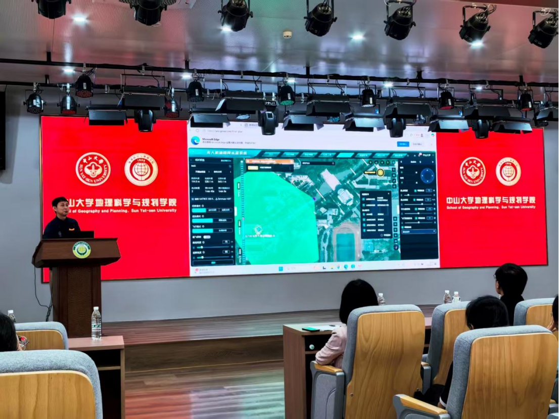 特色展示环节凸显科技赋能与实践价值。院长助理齐志新副教授展示了无人机值守库设备及其在遥感监测、智慧城市等领域的应用;飞鸟团队的傅浩同学则分享了“飞鸟管家・空天地一体化智慧农业管理系统”,生动展现地理技术在智慧农业中的实际成效。在屏幕实时呈现的无人机巡查影像与鲜活的荔枝种植案例中,前沿技术从课堂走向现实,同学们不仅听得入神、看得真切,更点燃了对科技应用与专业实践的浓厚兴趣。