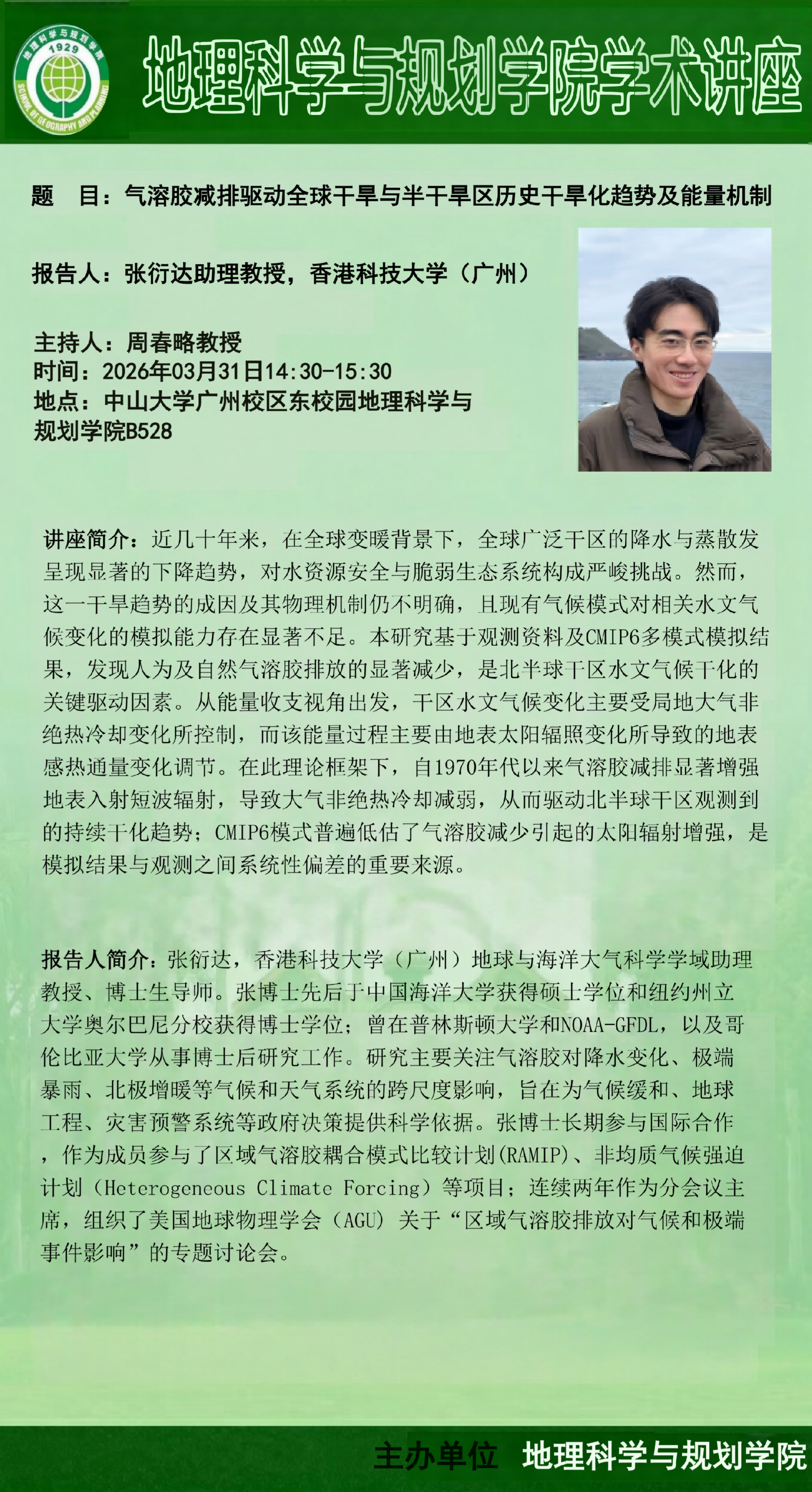 讲座预告|气溶胶减排驱动全球干旱与半干旱区历史干旱化趋势及能量机制