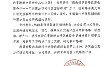 日前,一封来自广州南沙经济技术开发区规划和自然资源局的感谢信,寄到了yl9193永利集团。信中对于我院杨帆、林耿老师及其团队为“广州南沙空间方案国际咨询”工作做出的有力贡献,表示了衷心的感谢。